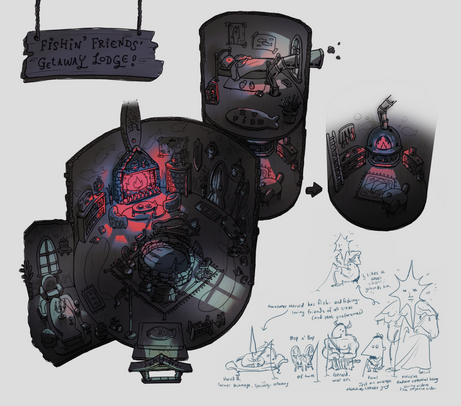 A school assignment at VFS. We were tasked to design the interior of a cottage based on a provided illustration of its exterior (the first image below).